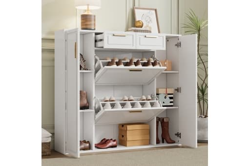 - Wszechstronna przestrzeń do przechowywania: dwie małe szuflady zapewniają miejsce na drobne przedmioty, takie jak klucze lub karty. Szafka posiada także wiele pojemnych przegródek i wygodne otwarte półki, które mogą pomieścić od 10 do 15 par butów w różnych rozmiarach i stylach.
