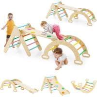 Zestaw LIFEZEAL 7 w 1 to rozbudowana konstrukcja do wspinania, która łączy trójkąt wspinaczkowy, zjeżdżalnię, rampę, drabinkę oraz łuk wspinaczkowo-bujany, oferując aż siedem różnych form zabawy. Dzięki temu dziecko może swobodnie się wspinać, zjeżdżać, balansować i bujać, rozwijając koordynację, równowagę oraz motorykę już od 1. roku życia.