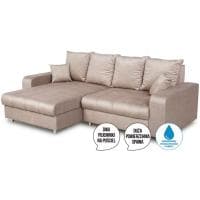 Funkcjonalny narożnik z dużą powierzchnią spania 158×203 cm zapewnia komfort na co dzień i dla gości. Model posiada dwa pojemniki na pościel, sprężyny faliste w siedzisku i oparciu oraz zestaw poduszek zwiększających wygodę. Tkanina z technologią Nano Block ułatwia czyszczenie, a uniwersalny montaż prawo/lewo pozwala dopasować mebel do każdego salonu.