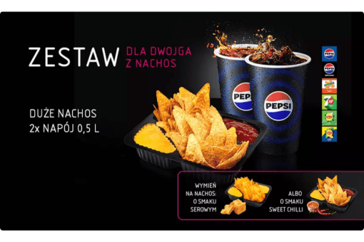 - Zestaw dla dwojga z nachos: 175g nachos (sos serowy lub salasa) + 2x napój z automatu 0,5l - 51,99 zł